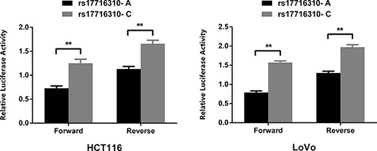 The 2001 bp DNA fragments, which were 1 kb upstream and downstream flanking A and C allele of rs17716310 (chr5: 134475759-134477759), were synthesized and cloned into Kpnl and Xhol restrictive sites of the pGL3-promoter vector (Promega) in both forward and reverse directions (Genewiz). The constructed plasmids were sequenced to verify the accuracy. HCT-116 and LoVo cells (1.25 × 104 cells/well) were seeded into 96-well plates. Cells were co-transfected with 100 ng constructed vector (with the A allele or C allele) and 1ng pRL-SV40 Renilla luciferase plasmid (Promega) using Lipofectamine 3000 Reagent (Life Technologies) according to the manufacturer’s instructions. After 24 hours, Firefly and Renilla luciferase activities were determined with the Dual-Luciferase Reporter Assay System (Promega). As the relative luciferase activity, the ratio of Firefly to Renilla luciferase activities was calculated for each sample. Three independent transfection experiments were carried out, and each experiment was conducted in triplicate. The data was presented as mean ± SD (standard deviation) and two-sided P-values were calculated using the Student’s t-test.