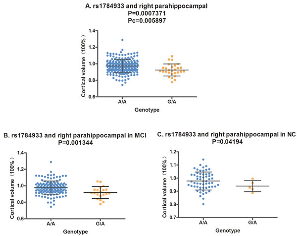Figure 1: The correlation between rs1784933 and right parahippocampal volume in the two-year follow-up study. A. Rs1784933 was associated with the volume of right parahippocampal in hybrid population. B. Rs1784933 was associated with the volume of right parahippocampal in MCI group. C. Rs1784933 was associated with the volume of right parahippocampal in NC group.