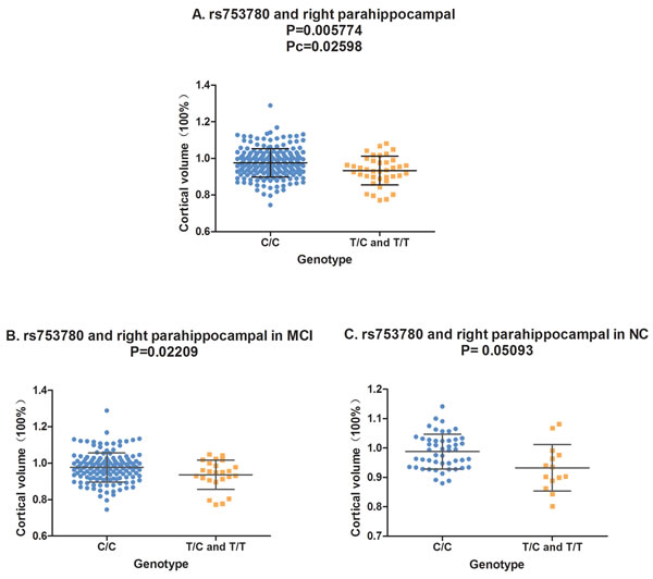 Figure 2: The correlation between rs753780 and right parahippocampal volume. A. Rs753780 was associated with the volume of right parahippocampal in hybrid population. B. Rs753780 was associated with the volume of right parahippocampal in MCI group. C. Rs753780 showed no association with the volume of right parahippocampal in NC group.