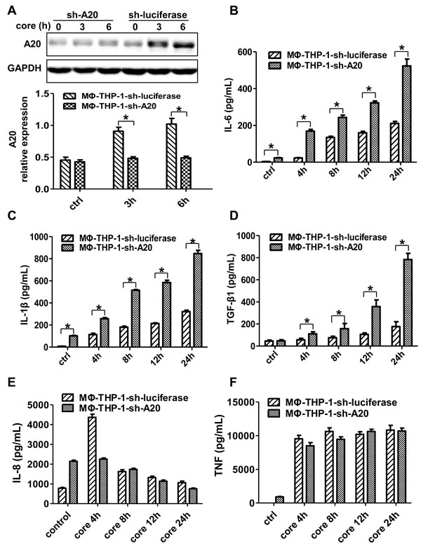 Figure 2: A20 negatively regulates the IL-6, IL-1β and TGF-β1 production. A. MΦ-THP-1 cells expressing A20-specific shRNA or luciferase-specific shRNA were treated with core protein for 3 and 6 hours, cell lysates were analyzed by immunoblotting to examine the A20 expression. The secretion of IL-6 B., IL-1β C., TGF-β1 D., IL-8 E. and TNF F. in cell culture supernatants of MΦ-THP-1 cells expressing A20-specific shRNA or luciferase-specific shRNA treated with core protein (10μg/mL) in different times were analyzed by CBA.