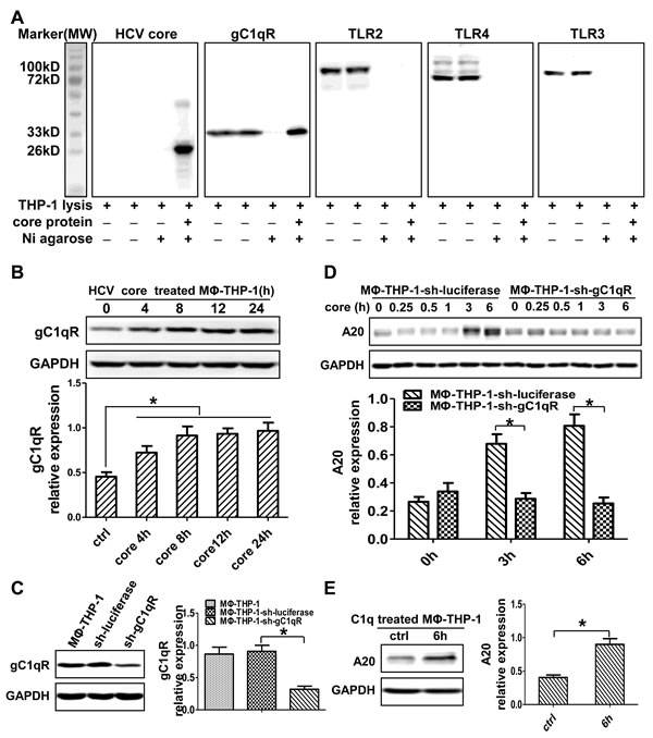 Figure 3: HCV core protein interacting with gC1qR induces A20 expression. A. MΦ-THP-1 cell lysates were incubated with purified core protein coupling Ni agarose, the bound proteins were identified by immunoblotting with indicated antibodies. B. MΦ-THP-1 cells were treated with core protein (10μg/mL) for 4, 8, 12 and 24 hours, cell lysates were analyzed by immunoblotting to examine the gC1qR expression. C. Cell lysates of MΦ-THP-1 and MΦ-THP-1 cells expressing gC1qR-specific shRNA or luciferase-specific shRNA were analyzed by immunoblotting to detect the gC1qR expression. D. MΦ-THP-1 cells expressing gC1qR-specific shRNA or luciferase-specific shRNA were treated with core protein for indicated times. Cell lysates were analyzed by immunoblotting to examine the A20 expression. E. Experiment was carried out to test A20 expression in MΦ-THP-1 cells treated with C1q (70μg/mL) for 6 hours.