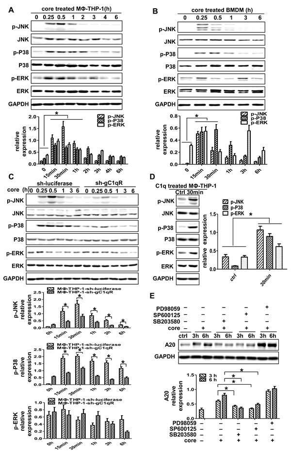 Figure 4: P38 and JNK signaling pathways play pivotal roles in the induction of A20. MΦ-THP-1 cells A., BMDM B. and MΦ-THP-1 cells expressing gC1qR-specific shRNA or luciferase-specific shRNA C. were treated with core protein (10μg/mL) in different times, cell lysates were analyzed by immunoblotting with indicated antibodies. D. MΦ-THP-1 cells were treated with C1q (70μg/mL) for 30 minutes, cell lysates were analyzed by immunoblotting with indicated antibodies. E. MΦ-THP-1 cells were pretreated with SB203580 (30μM), SP600125 (20μM) or PD98059 (50μM) for 30 minutes respectively, then incubated with core protein for 3 and 6 hours, cell lysates were analyzed by immunoblotting to examine the A20 expression.