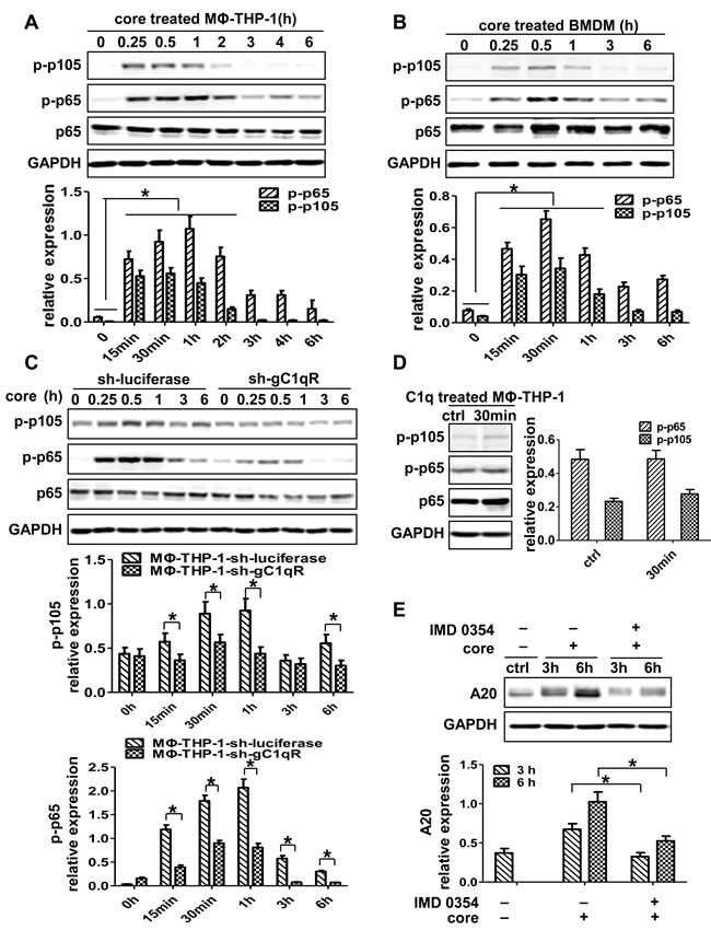 Figure 5: NF-κB signaling pathway plays critical role in the induction of A20. MΦ-THP-1 cells A., BMDM B. and MΦ-THP-1 cells expressing gC1qR-specific shRNA or luciferase-specific shRNA C. were treated with core protein (10μg/mL) in different times, cell lysates were analyzed by immunoblotting with indicated antibodies. D. MΦ-THP-1 cells were treated with C1q (70μg/mL) for 30 minutes, cell lysates were analyzed by immunoblotting with indicated antibodies. E. MΦ-THP-1 cells were pretreated with IMD 0354 (3μM) for 30 minutes, then incubated with core protein for 3 and 6 hours, cell lysates were analyzed by immunoblotting to examine the A20 expression.