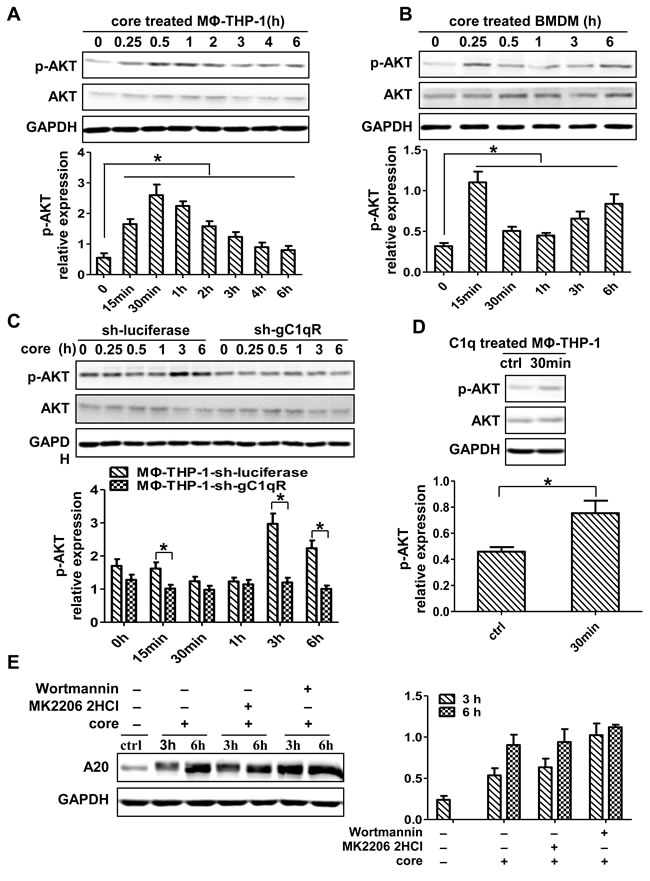Figure 6: PI3K/AKT signaling pathway has no direct effect on the induction of A20. MΦ-THP-1 cells A., BMDM B. and MΦ-THP-1 cells expressing gC1qR-specific shRNA or luciferase-specific shRNA C. were treated with core protein (10μg/mL) in different times, cell lysates were analyzed by immunoblotting with indicated antibodies. D. MΦ-THP-1 cells were treated with C1q (70μg/mL) for 30 minutes, cell lysates were analyzed by immunoblotting with indicated antibodies. E. MΦ-THP-1 cells were pretreated with MK 2206 2HCl (5μM) or Wortmannin (200nM) for 30 minutes respectively, then incubated with core protein for 3 and 6 hours, cell lysates were analyzed by immunoblotting to examine the A20 expression.