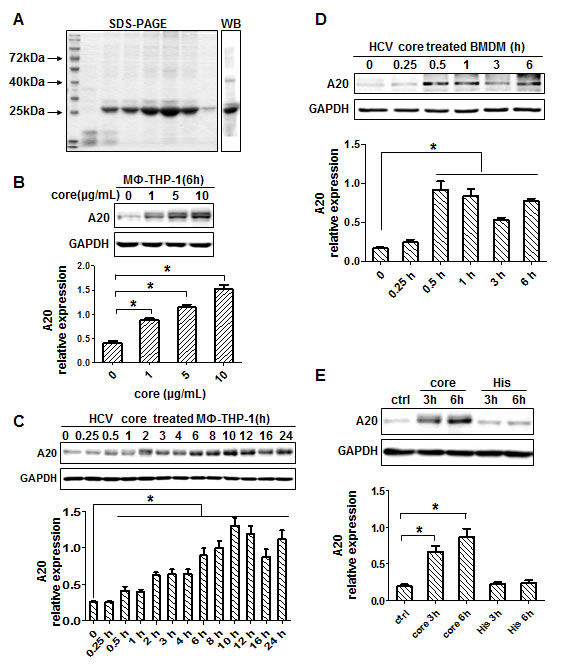 Figure 1: HCV core protein induces A20 expression. A. HCV core protein was analyzed by SDS-PAGE and Western blot. B. A20 was upregulated in MΦ-THP-1 cells treated with different doses of core protein (1, 5, 10μg/mL). MΦ-THP-1 cells C. and BMDM D. were treated with core protein (10μg/mL) for different times, and cell lysates were analyzed by immunoblotting to examine the A20 expression. E. MΦ-THP-1 cells were treated with core protein and His peptide for 3 and 6 hours, and cell lysates were analyzed by immunoblotting to examine the A20 expression.