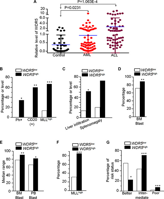 Figure 1: WDR5 expression in AML and ALL and its correlation with clinical features. (A) WDR5 expression in ALL and AML. WDR5 was detected by qPCR in ALL and AML patients’ samples and compared to normal bone marrow tissue (control). The relative level of WDR5 mRNA was calculated by standard curve. The difference of the WDR5 expression was analyzed with student t-test. P < 0.05 are considered as significant. (B–D): Correlation of WDR5 high and low expression with clinical features in patients with ALL. (E–G) Correlation of WDR5 high and low expression with clinical features in patients with AML. *P < 0.05; **P < 0.01; ***P < 0.0001.