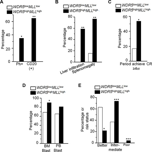 Figure 2: Clinical features of patients with WDR5highMLLhigh in ALL and AML. (A–C) Comparison of clinical features of ALL patients with WDR5highMLLhigh to that with WDR5 lowMLLlow. (D–E) Comparison of clinical features in AML patients with WDR5highMLLhigh to that with WDR5 lowMLLlow. *P < 0.05; **P < 0.01; ***P < 0.0001.