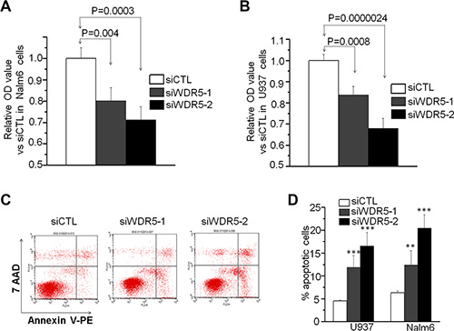 Figure 3: WDR5 knockdown induces proliferation arrest and cell apoptosis in ALL and AML cells. (A–B) WDR5 knockdown induced the proliferation arrest in Nalm6 B-ALL (A) and U937 AML (B) cells. siWDR5–1=WDR5 shRNA #1, siWDR5–2=WDR5 shRNA #2; siCTL=scramble shRNA. P < 0.05 are considered as significant. (C and D) WDR5 knockdown increased the apoptotic cell rate in the cells. C is the representative flow data in Nalm6 cells. D is the quantitation data in Nalm6 and U937 cells. **P < 0.01; ***P < 0.0001.