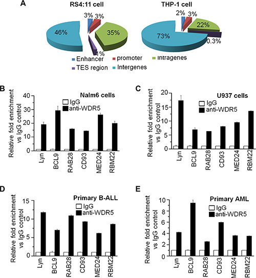 Figure 4: Genome-wide distribution of WDR5 and Gene Ontology (GO) analysis. (A) Percentages of peaks that bind sites in each location are given. (B–E) qChIP data showed that WDR5 binds to the promoter region of its targets identified by ChIP-seq in leukemic cell lines-Nalm6 (B) and U937 cells (C) as well as primary B-ALL (D) and AML (E).
