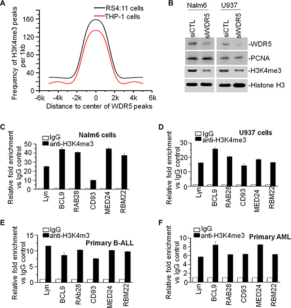 Figure 5: WDR5 associates with MLL in leukemia cells and global accumulation of H3K4me3 around the WDR5 binding peaks (A). Distribution of H3K4me3 peaks relative to the center of WDR5 peak in RS4;11 and THP-1 cells. Graphed is the frequency of H3K4me3 in all WDR5 peaks, over a 1 kb span. (B) Effect of WDR5 knockdown on H3K4me3 level. (C–F) H3K4me3 enrichment in the promoter region of WDR5 targets in cell lines, Nalm6 (C) and U937 (D) cells, and primary B-ALL (E) and AML (F) cells.