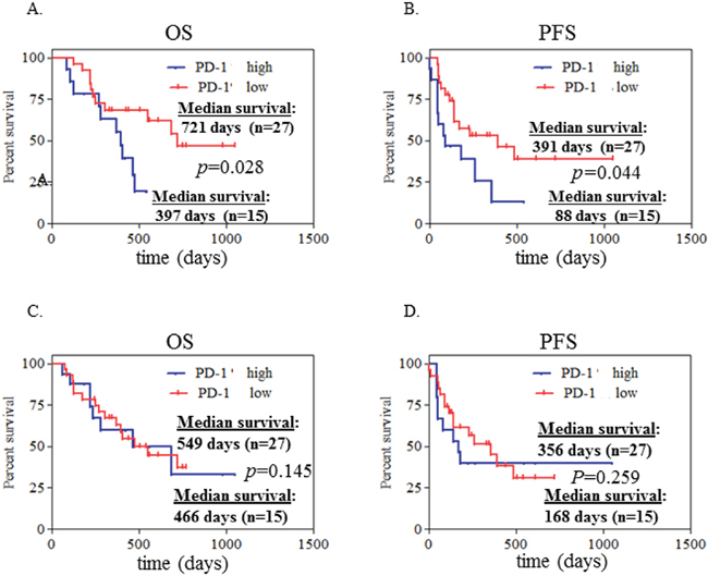 Figure 4: High expression of PD-1 on CD4+ T cells at initial diagnosis associated with poor clinical outcome in advanced NSCLC patients. Kaplan-Meier curves of 42 patients with advanced NSCLC segregated into 2 groups A, B. according to the median value of PD-1+ CD4+% cells (with 12.27% as a threshold). PD-1+% CD4+ cells >12.27% was defined as PD-1+% high while <12.27% as PD-1+% low. Likewise, these 42 patients were also segregated into 2 groups C, D. according to the median value of PD-1+ CD8+% cells (with 11.75% as a threshold). PD-1+% CD8+ cells >11.75% was defined as PD-1+% high while <11.75% as PD-1+% low. Statistical significance was determined by a Log-rank (Mantel-Cox) Test.