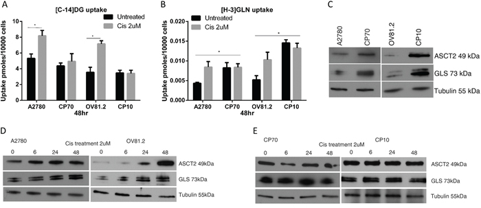 To investigate changes in glucose and glutamine utilization we assessed the uptake of radiolabeled [C-14]deoxyglucose ([C-14]DG) and [H-3]glutamine ([H-3]GLN) during cisplatin treatment. We evaluated two paired cell lines: the cisplatin sensitive A2780 cell line and its cisplatin resistant derivative CP70, together with the cisplatin sensitive OV81.2 cell line, which is a primary cell line derived from a high grade serous ovarian cancer patient. The cisplatin resistant derivative OV81.2-CP10 (referred to as CP10 henceforth) was derived by propagating OV81.2 cells in the presence of cisplatin for 10 passages thus selecting for resistant clones [24].