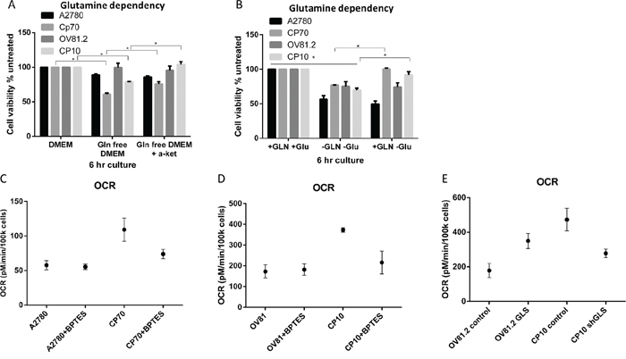 Figure 2: Cisplatin resistant cells depend on glutamine for oxidative phosphorylation. A. Ovarian cancer cell lines were cultured in complete media, glutamine free or glutamine free containing α-KG (4 mM). B. Added GLN restores cell viability of CP70 and CP10 cells but not A2780 or OV81.2 cells. Cell viability was determined using the Vi-CELL trypan blue exclusion counter. Experiments were performed in triplicate and repeated 3 times. Viability is expressed relative to the cell line grown in complete media. Graphs represent mean (boxes) and SD (bars; n=9). C. A2780 or CP70 D. OV81.2 or CP10 cells were treated with DMSO or BPTES (50uM) for 24 hr before measuring oxygen consumption rate (OCR). OCR is increased in resistant cell lines compared to the sensitive cell lines. The decrease using BPTES (50uM) confirms the glutamine dependency of cisplatin resistant CP70 and CP10 cells. Experiments were carried out in triplicates and repeated 3 times. Graphs represent mean (dots) and SD (bars; n=9). E. GLS over expression in the sensitive cell line OV81.2 results in increased OCR compared to OV81.2 control (p<0.01). CP10 shGLS transduced cells have reduced OCR compared to CP10 shRNA control (p<0.01).