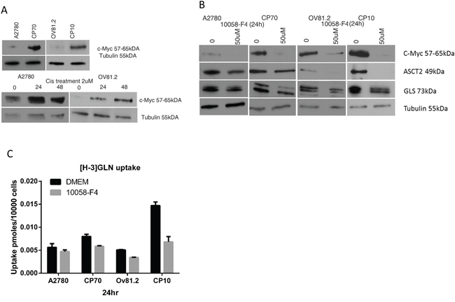 Figure 3: c-Myc regulates glutamine metabolism in cisplatin resistant cells. A. Western blot showing increased c-Myc expression in the resistant cell lines compared to the sensitive cell lines as well as increasing c-Myc expression in A2780 and OV81.2 cells after 24 and 48hr of cisplatin (2uM) treatment. B. Western blot showing reduction of c-Myc, ASCT2 and GLS expression in A2780/CP70 and OV81.2/CP10 in response to treatment with c-Myc inhibitor 10058-F4 (50uM). C. C-Myc inhibition using 50uM 10058-F4 decreased [H-3]GLN uptake in all cell lines, which is more pronounced in the CP70 and CP10 cells. Uptake is normalized to cell number. Experiments were performed in triplicate and repeated 3 times. Graphs present mean (boxes) and SD (bars; n=9).