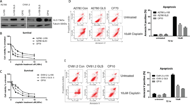Figure 4: GLS overexpression confers cisplatin resistance. A. Western blot confirms over expression of glutaminase (GLS) in A2780 and OV81.2 cells similar to the expression level found in the resistant cell lines. B. A2780 GLS over expressing cells and A2780 expressing control LV05 vector and C. OV81.2 GLS over expressing cell and OV81.2 expressing control LV05 vector were treated with increasing concentrations of cisplatin. After 48 hr treatment cell viability was assessed by Vi-CELL trypan blue counter. Experiments were performed in duplicate and repeated 3 times. Graphs present mean (dots) and SD (bars; n=6) of percentage viable cells relative to untreated. Apoptosis was measured using annexin V staining in D. A2780 expressing control LV05 vector, A2780 GLS over expressing cells and CP70 cells, and E. OV81.2 expressing control LV05 vector, OV81.2 GLS over expressing cells and CP10 cells. Cells were incubated with and without cisplatin (10uM) for 72 hr. Experiments were performed in duplicate and repeated 3 times. Graphs present mean (boxes) and SD (bars; n=6) of total apoptosis. Total apoptosis is the sum of the percentage of annexin V only and annexin V / propidium iodide stained cells.