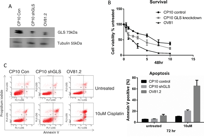 Figure 5: Loss of GLS expression re-sensitizes resistant cells to cisplatin. A. Western blot confirms reduced expression of glutaminase (GLS) in CP10 shGLS similar to the expression level found in the sensitive cell lines. B. CP10 shGLS, CP10 shRNA control and OV81.2 were treated with increasing concentrations of cisplatin. After 48 hr treatment cell viability was assessed by Vi-CELL trypan blue counter. Experiments were performed in duplicate and repeated 3 times. Graphs present mean (dots) and SD (bars; n=6) of percentage viable cells relative to untreated. C. Apoptosis was measured using annexin V staining in CP10 shGLS, CP10 shRNA control and OV81.2. Cells were incubated with and without cisplatin (10uM) for 72 hr. Experiments were performed in duplicate and repeated 3 times. Graphs present mean (boxes) and SD (bars; n=6) of total apoptosis. Total apoptosis is the sum of the percentage of annexin V only and annexin V / propidium iodide stained cells.