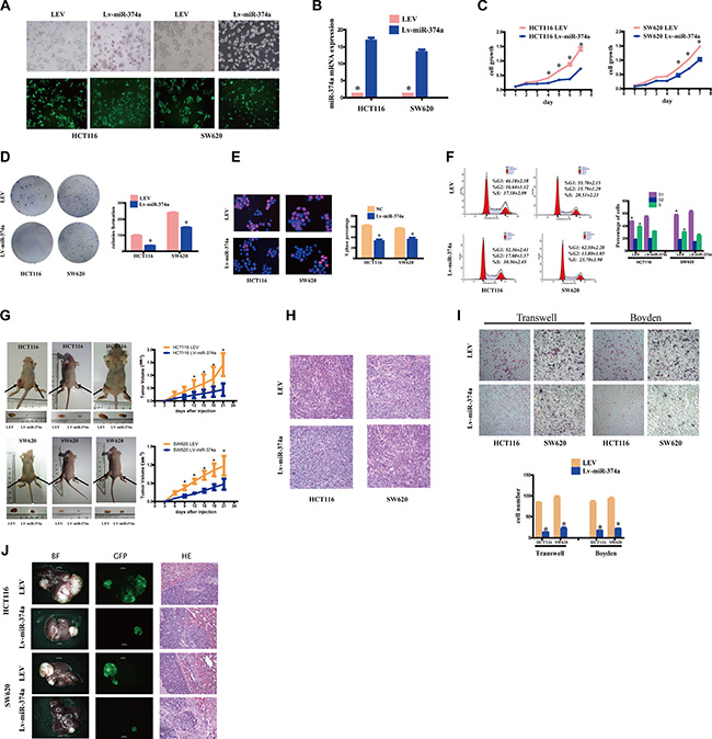 Figure 1: miR-374a overexpresssion inhibits proliferation, invasion and migration in vitro and in vivo. (A) HCT116 and SW620 cells were transfected with Lv-miR-374a and LEV. Green fluorescent protein (GFP) expression was used to monitor the transfection efficiency. (B) miR-374a expression measured by qRT-PCR following overexpression of Lv-miR-374a. Experiments were repeated three times with similar results, and error bars represent mean ± SEM, *P < 0.05. C-F. The in vitro function of miR-374a was measured by MTT assay (C), Colony-forming assay (D), Edu assays (E), FCM (F) in HCT116-Lv-miR-374a and SW620-Lv-miR-374a cells. Experiments were repeated three times with similar results, and error bars represent mean ± SEM, *P < 0.05. G-H. Excised tumors 20 days after HCT116-Lv-miR-374a and SW620-Lv-miR-374a implantation (G) and representative H&E staining (H) of primary cancer tissues are shown. Black arrows showed the tumors. (I) Effect on invasion and migration of miR-374a was measured by Transwell and Boyden Chamber assays in HCT116-Lv-miR-374a and SW620-Lv-miR-374a cells. Experiments were repeated three times with similar results, and error bars represent mean ± SEM, *P < 0.05. (J) In vivo intrahepatic metastasis assays results after HCT116-Lv-miR-374a and SW620-Lv-miR-374a injection.
