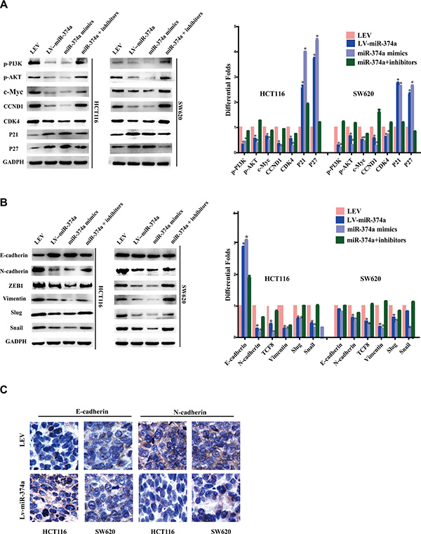 Figure 3: miR-374a is a negative regulator of PI3K/AKT signaling and suppresses cell cycle, invasion and migration relevant genes. (A–B) Western blot analysis of the protein levels of p-PI3K, p-AKT, c-Myc, CCND1, CDK4, P21, P27 (A) as well as invasion and migration relevant protein levels of E-cadherin, N-cadherin, ZEB1, Vimentin, Slug and Snail (B) in response to overexpressed or silenced miR-374a expression. (C) Expression of E-cadherin and N-cadherin in tumor tissues were measured by IHC.