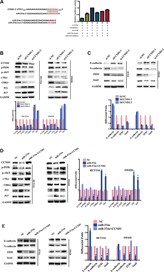 Figure 4: As a target of miR-374a, CCND1 exerts feedback on PI3K/AKT pathway and downstream cell cycle and EMT genes. (A) miR-374a and its putative binding sequences in the 3’UTR of CCND1. Mutations were generated in the complementary site that binds to miR-374a. Luciferase reporter assays were used to determine whether miR-374a directly binds the 3′UTR of CCND1. Experiments were repeated three times with similar results, and error bars represent mean ± SEM, *P < 0.05. (B–C) HCT116 and SW620 cells were transfected with two sequences of si-CCND1 or controls. Western blot analyzed the expression of CCND1, p-PI3K, p-AKT, c-Myc, CDK4, P21, P27 (B) as well as invasion and migration relevant protein levels of E-cadherin, N-cadherin, ZEB1, Snail (C). (D–E) HCT116-Lv-miR-374a and SW620-Lv-miR-374a cells were transfected with a plasmid encoding CCND1. Western blot analyzed the expression of CCND1, p-PI3K, p-AKT, c-Myc, CDK4, P21, P27 (D) as well as invasion and migration relevant protein levels of E-cadherin, N-cadherin, ZEB1, Snail (E).