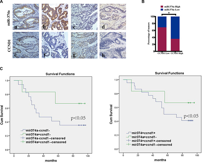 Figure 6: The correlation between miR-374a and CCND1 in colon cancer tissues and their clinical significance. (A) In situ hybridization and immunohistochemistry results showing the expression level of miR-374a and CCND1 at same locations in colon cancer tissues. Figures a, b, e, g represent high expression, c, d, f, and h represent low expression. Among them, figure a and e were form case1, b and f from case2, c and g from case 3, d and h from case 4. Original magnification 400×. (B) Percentage of specimens exhibit low or high miR-374a expression in relation to CCND1 expression. (C) Kaplan-Meier survival curve comparing subgroups based on miR374a or CCND1 expression in the primary tumors of colon cancer patients: low CCND1 expression cases with either high or low miR-374a expression as well as high miR-374a expression cases with either high or low CCND1 expression. P value is based on a log-rank test.