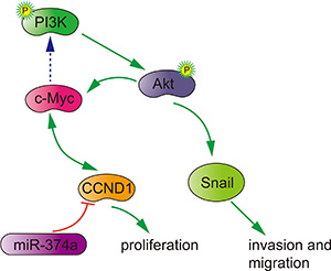 In summary, miR-374a functions as a tumor suppressor by inactivating PI3K/AKT signaling and downstream signals. This negative regulation is accomplishing by directly reducing CCND1 to inhibit proliferation, invasion and migration in colon cancer cells (Figure 7). We also observed that high miR-374a and low CCND1 expression in patient samples is associated with favorable outcomes, which suggests that miR-374a and CCND1 may be useful prognostic biomarkers. Because targeting driver pathways represents the best option to tailor cancer treatment and improve survival in patients [23], our study indicates that overexpressing miR-374a may be a promising therapy for colorectal cancer patients.
