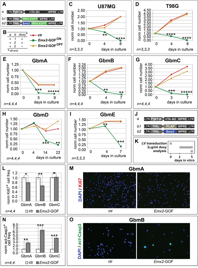 Figure 1: Population dynamics of Emx2 gain-of-function GBM cultures. In vitro kinetic progression of U87MG, T98G, GbmA, GbmB, GbmC, GbmD and GbmE GBM lines C-I., engineered by lentiviral vectors and TetON technology as in A, B., and kept as adherent C, D. or floating cultures E-I., under Fgf2 and Egf. Ki67+ proliferating L, M. and activated-Casp3+ apoptotic N, O. fractions of GbmA, GbmB and GbmC glioblastoma cells, engineered by control (J., a-b1) and Emx2-GOF (J, a-b2) lentiviral sets, and kept as floating cultures according to the timetable in K. Cell numbers were normalized against t=0 values (C-I), or control values L, N. [As for (L, N), absolute average control cell frequencies were: 0.207, 0.155 and 0.131 (Ki67+, in GbmA, GbmB and GbmC cultures, respectively); 0.001, 0.012 and 0.012 (actCasp3+, in GbmA, GbmB and GbmC cultures, respectively)]. n is the number of biological replicates. p-value was calculated by t-test (one-tail, unpaired): *p<0.05, **p<0.01, ***p<0.001, ****p<0.0001, *****p<0.00001.