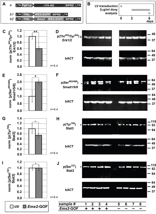 Figure 2: Immunoprofiling of Emx2 gain-of-function GBM cultures for key intracellular signalling transducers. Evaluation of p(Thr202/Tyr204)Erk1/2 C, D., p(Ser463/Ser465)Smad1/5/8 E, F. p(Tyr705)Stat3 G, H. and p(Ser727)Stat3 I,J. levels in U87 cell samples, engineered as in A, B. Values were normalied against controls. n is the number of biological replicates. p-value was calculated by t-test (one-tail, unpaired): *p<0.05, **p<0.01.
