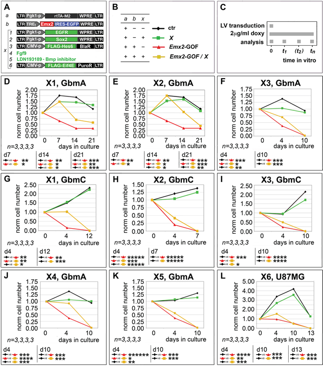 Figure 3: Rescue of Emx2 antioncogenic activity via modulation of its presumptive mediators. GBM cells were engineered and cultured as in A-C. In particular, lentiviruses harboring an IRES-EGFP or a PLAP module under the control of a TREt promoter were used as controls for “b” and “X1, X2, X3, X6”, respectively. Cells were scored for the capability of selected “X” agents (restoring presumptive mediators of Emx2 anti-oncogenic activity) to rescue their control kinetic profiles D-L. n is the number of biological replicates. p-value was calculated by t-test (one-tail, unpaired).