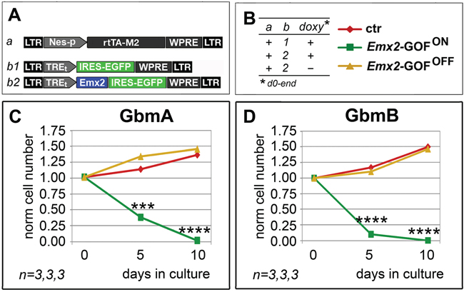 Figure 5: Persisting antioncogenic efficacy of Emx2 upon neural nestin enhancer-restricted overexpression. In vitro kinetic progression of GbmA and GbmB lines C, D., engineered by lentiviral vectors and TetON technology as in A, B., and kept as floating cultures, under Fgf2 and Egf. Cell numbers were normalized against t=0 values. n is the number of biological replicates. p-value was calculated by t-test (one-tail, unpaired): ***p<0.001, ****p<0.0001.