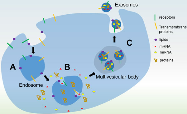 Figure 1: Biogenesis of exosomes. A. An endosome forms from invagination of the plasma membrane to surround macromolecules or other cargos within the extracellular environment. Proteins on the plasma membrane are found on the endosomal membrane. B. Invagination of the endosomal membrane forms a multivesicular body (MVB). Intracellular proteins and RNA are packaged into the microvesicles in the MVB. C. Fusion of the MVB with the plasma membrane releases the microvesicles as exosomes into the extracellular milieu in an exocytic process.