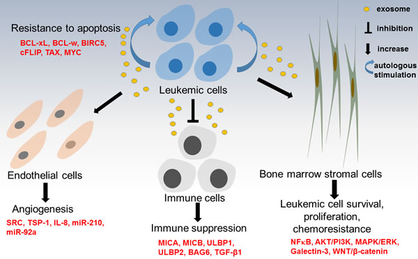 Figure 2: Summary of role of exosomes in leukemogenesis. Leukemia-derived exosomes can activate bone marrow stromal cells (BMSCs) to promote leukemia cell survival, proliferation and resistance to chemotherapy. Leukemia-derived exosomes impair the host immune system to create an immunosuppressive state, facilitating immuoescape of leukemia cells. Leukemia-derived exosomes transfer pro-angiogenic molecules into endothelial cells to enhance angiogenesis and provide a favourable microenvironment for leukemia cells themselves. Moreover, leukemia-derived exosomes can help leukemia cells develop resistance to apoptosis through transferring pro-survival BCL-2 from apoptosis-resistant AML blasts to apoptosis-sensitive AML cells.