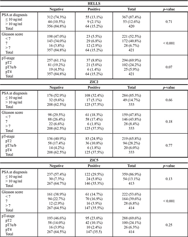 A caveat of the current study was the relatively low number of samples in both cohorts, which hampered robust biostatistical analysis. Therefore, we set less stringent discriminatory criteria for comparing both study groups and selected a panel of genes for further validation. We applied immunohistochemistry for validation of differential gene-expression profiles and did not include a validation by QPCR on independent laser microdissected patients samples. While our purpose was to validate genes such as HELLS and ZIC5 immunohistochemically on diagnostic GS 3 + 3 = 6 biopsies to select patients with actual GS ≥ 7 disease, biopsy validation was not included in the current study. Since retrospective biopsy studies are hampered by the fact that a significant number of biopsies will not have representative tissue available anymore, we are currently analyzing the predictive value of HELLS and ZIC5 in a prospective biopsy study.
