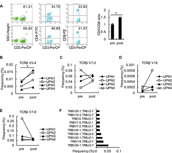 Figure 4: Analysis of changes in relative TCRβ V and TCRβ J. (A) PBMCs from the 4 patients were collected as detected by flow cytometry using antibodies against CD3, CD4, and CD8. The average ratios of CD3+CD4+: CD3+CD8+ from these patients are shown. (B–E) The frequencies of TCRβ V5-4 (B), TCRβ V7-2 (C), TCRβ V18 (D) and TCRβ V7-9 (E) in PBMCs from each patient before and after decitabine therapy are shown. (F) The top 10 V-J combinations in PBMCs from the 4 patients following decitabine therapy are listed.