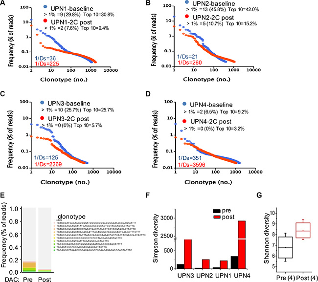 Figure 5: Low-dose decitabine increased TCR diversity in PBMCs. (A–D) Frequency distribution of clonotypes in plots of UPN1 (A), UPN2 (B), UPN3 (C), and UPN4 (D) at baseline (in blue) and after 2 cycles of decitabine therapy (in red). Each dot represents a distinct TCRβ clonotype. Clonotypes are presented at frequencies > 1% and the top 10 clonotypes with their cumulative frequency (percentage of reads). Values in the lower-left corner depict TCR diversity. (E) The 10 most frequent clonotypes in the 4 patients at baseline (pre) and after 2 cycles of decitabine therapy (post) are indicated in color and listed at the right; the remaining clonotypes are grouped in black. (F) TCR Simpson diversity of the 4 patients after 2 cycles of decitabine therapy compared to that of the baseline. (G) The average T cell repertoire Shannon diversity of the 4 patients before and after decitabine therapy.