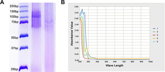 Figure 1: Confirmation of mAb-CD133 conjugation to PAMAM. (A) The conjugated production of PAMAM and mAb-CD133 was observed by SDS-PAGE. Lane 1. marker Lane2. PD-CD133 Lane.3 mAb-CD133 (B) Ultraviolet-visible spectra of bioconjugated production PD-CD133. Characteristic absorbance peak at about 260 nm and 280 nm indicated the presence of BSH and CD133 antibody, respectively. 1.BSH 2.mAb-CD133 3.PAMAM 4.PD-CD133 5.PD-CD133/BSH.