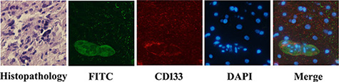 Figure 6: PD-CD133/BSH was specifically localized in CD133+ SU2 cells in orthotopic glioma xenografts. (A) Tumor pathologic examination confirmed the formation of intracranial glioblastoma derived from SU2 cells. (B) Green fluorescence was derived from PD-CD133/BSH, and red fluorescence represented CD133 stain using immunofluorescence (×400).