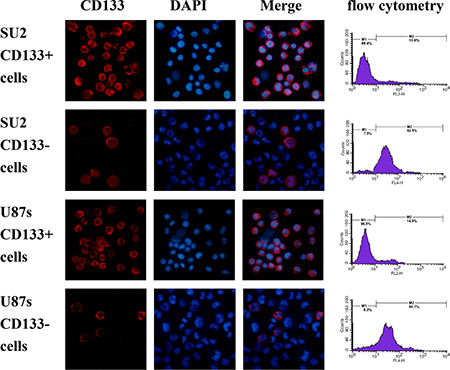 In order to detect the percentage of SU2 and U87s cells with CD133+ surface marker and sorting efficiency, a quantitative analysis of CD133 positive cells was performed using flow cytometry. After sorting by magnetic beads, the two cell lines were separated into two groups, respectively. In the CD133+ group, 92.5% SU2 or 90.7% U87s cells positively expressed the CD133 marker, and 89.4% SU2 or 86.5% U87s cells did not express the CD133 marker in the CD133− group (Figure 3). Immunofluoresence staining results showed that a majority of both SU2 and U87s cells strongly expressed glioma stem cell marker CD133 in CD133+ group and did not express CD133 marker in CD133- group, which mediate self-renewal and proliferation of stem cells (Figure 3).