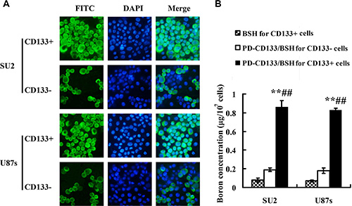 Figure 4: Uptake efficacy for PD-CD133/BSH and 10B concentration (n = 3). (A) Uptake efficacy of sorted CD133+ and CD133− GSCs observed in fluorescence microscope with 0.1 μM PD-CD133/BSH for 12 h (×400). (B) Concentration of boron in cultured GSCs incubated with 0.1 μM PD-CD133/BSH solution or 2.2 μM BSH for 12 h. Boron accumulation in both SU2 and U87s CD133+ cells cultured with PD-CD133/BSH was significantly higher than in the CD133− cells (P < 0.01) and BSH treatment (P < 0.01). **P < 0.01 vs. PD-CD133/BSH for CD133− cells; ##P < 0.01 vs. BSH for CD133+ cells.