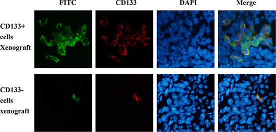 Figure 3: Identification of sorted GSCs. The percentage of CD133-positive cells in sorted GSCs analyzed by flow cytometry, and fluorescence images of sorted GSCs, immunostained with antibodies against CD133, were captured with fluorescence microscope (×400).