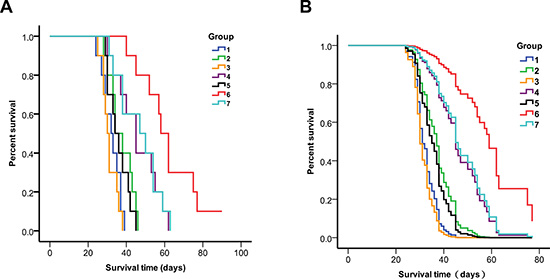 The condition of the mice was monitored daily for brain tumor symptoms, and weighed three times a week. Common symptoms such as sustained weight loss, ataxia and periorbital bleeding, or a combination thereof, indicated imminent death. When symptoms of death appeared, mice were euthanized and survival times were calculated according to the time between tumor transplantation and euthanization. Mice surviving more than 3 months were designated long-term survivors and were euthanized. The mean survival time (MST) and median survival time were calculated for each group.