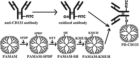 The conjugation of PAMAM to anti-CD133 monoclonal antibody (mAb-CD133) was confirmed by SDS-PAGE. A 70 KDa band was seen in the mAb-CD133 group, compared with a 100 KDa band in the conjugate of PAMAM and mAb-CD133 (PD-CD133) group, and no band appeared in about 70 KDa range (Figure 1A). The results indicated successful conjugation and purification. Conjugation of mAb-CD133 and PAMAM was aided by ultraviolet-visible spectra of all bands scanned. The biconjugated PD-CD133 was observed at an absorption peak of 280 nm as mAb-CD133, but no peak appeared in PAMAM. Compound BSH showed an absorption peak at approximately 260 nm. Therefore, PD-CD133/BSH has absorption peaks at 260 nm and 280 nm, which were not distinct (Figure 1B). One mAb-CD133 molecule was conjugated to each molecule of PAMAM dendrimers, which was determined by SDS-PAGE, ultraviolet-visible spectra and Ellman assay. The concentration of the biconjugated PD-CD133 was calculated as 300 μM using a mAb-CD133 standard curve.