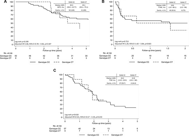 Figure 5: Bone disease-related outcomes of patients with breast cancer and bone metastases according to SNP rs34945627. (A) Bone disease-free survival. (B) Time to first skeletal-related event (SRE). (C) Time to bone progression. Adjusted hazard ratio controlling for age at diagnosis, radiographic pattern of bone metastases and NTX at diagnosis of bone metastases.