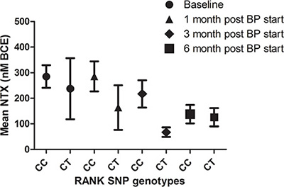 Figure 6: NTX values of patients with breast cancer and bone metastases according to SNP rs34945627 after bisphosphonates treatment (BPs). Results are expressed as the mean ± SEM.