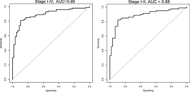 Figure 1: ROC Curve combined for the selected 6 microRNA analyzed in the validation set, for all stages (I-IV) and for only the early stages (I/II). The plot shows the sensitivity versus specificity. The area under the curve (AUC) gives a summary of the sensitivity and specificity across a range of different cut off points.