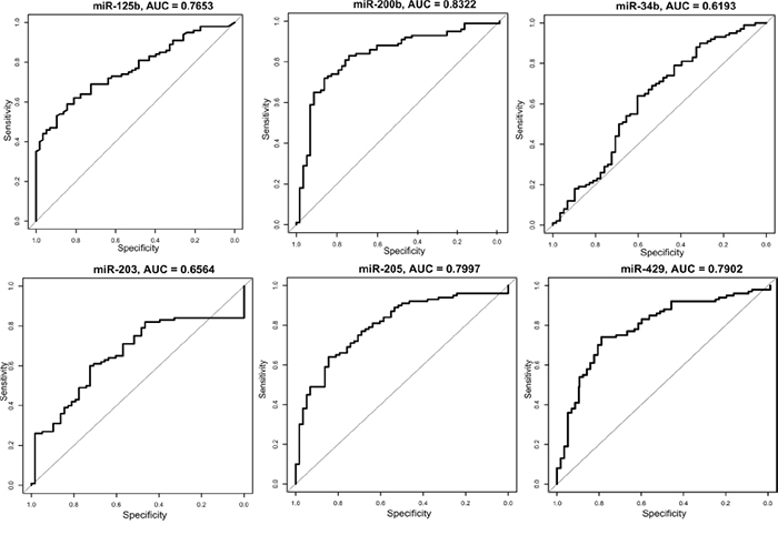 In order to visualize the sensitivity and specificity for the six microRNAs combined, a ROC curve was calculated (Figure 1). To see how each microRNA performed individually, a ROC curve and the area under the curve (AUC) was calculated for the 6 validated microRNAs (Figure 2). With an AUC on 0.83, miR-200b revealed the highest sensitivity and specificity of the 6 microRNAs.