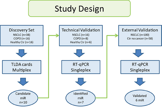 In the discovery set, the patients were diagnosed with operable NSCLC from 2006 to 2011, and underwent curatively intended surgical resection at Rikshospitalet, Oslo University Hospital, Norway. The procedure for blood samples handling are outlined in Supplementary Table 5. The study was approved by the Regional Ethics Committee (S-05307), and written informed consent was obtained from all patients. Clinical data were collected from questionnaires, the medical journal, histology reports and follow up information from the patients’ local hospitals. All patients selected for the discovery cohort were diagnosed with adenocarcinoma. A predominance of stage I and II were included due to inoperable tumors in later stages. In order to capture the profile of the never smokers, 47.4% of the lung cancer patients were never smokers. For all selected patients, microRNA profiling in tumor has previously been performed by Bjaanæs and colleges [12]. Sera from 16 patients diagnosed with COPD and 16 healthy volunteers were used as controls [40]. The overview of the study design is displayed in Figure 3 and the clinical data are shown in Table 2.