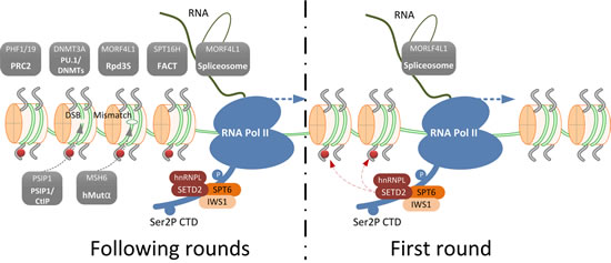 Modification of nucleosomes plays an important role in protecting genomic DNA and regulating its accessibility. A compact nucleosome structure of the gene body is needed to prevent spurious transcription initiation from cryptic promoters. Removal of this barrier during transcription elongation upon passage of RNA pol II results in a more accessible chromatin. Reconstitution of completely evicted nucleosomes with acetylated nucleosomes from the soluble pool after passage of RNA pol II could result in a more accessible chromatin structure of transcribed genes. This would allow intergenic transcription initiation from cryptic promoter sequences. Trimethylation of H3K36 during transcription elongation by RNA pol II-bound SETD2 is thought to prevent spurious transcription from cryptic promoters. H3K36me3 recruits Facilitates Chromatin Transcription complex (FACT) [52] and Polycomb repressive complex 2 (PRC2) [38, 53] to restore the repressed chromatin structure after elongation. The FACT complex disassembles the H2A-H2B dimer from the nucleosomes. After passage of RNA Pol II, the same complex promotes the replacement of the H2A-H2B dimers. This allows the transcription elongation complex to pass without the need to remove histone H4 and H3 [54]. Thus, the H3K36 trimethylated nucleosomes are kept on their position. The IWS1:SPT6:CTD complex is needed for the recruitment of SETD2 to RNA Pol II for trimethylation of H3K36 [55]. SPT6 was already known to enhance the elongation rate by displacing the nucleosomes in front of RNA pol II [56]. However, several studies have indicated that SPT6 also enhances the elongation rate in the absence of nucleosomes [57-59]. Experiments in S. cerevisiae have shown that inactivation of SPT6 or the FACT subunit Suppressor Of Ty 16 Homolog (SPT16H, also known as SPT16) resulted in intragenic transcription initiation events from cryptic promoters [52, 60, 61]. Taken together, the prevention of spurious intragenic transcription initiation is an important function of H3K36me3 and thus, indirectly, of SETD2.