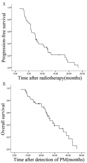 PFS was defined as the time from the initiation of radiotherapy to any type of metastatic lesion progression or new lesion appearance. OS was defined as the time from the detection of lung lesions to death from any cause or the last follow-up appointment. Relationships between clinical variables were assessed using Pearson’s chi-square test or Fisher exact test, whichever was appropriate. Survival curves were calculated using the Kaplan-Meier method, and univariate analysis was performed using the log-rank test. Multivariate analysis was performed using a forward-stepwise Cox regression model to explore associations between clinical variables and PFS or OS. A P value less than 0.05 was considered statistically significant. Data analyses were performed using SPSS version 16.0 for Windows.