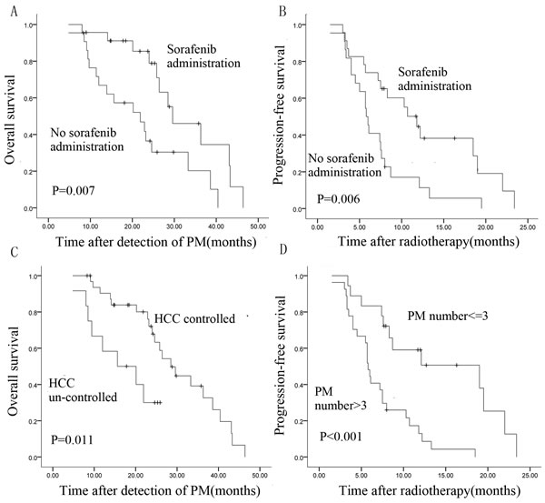 Figure 3: Kaplan-Meier survival curves of patients with pulmonary metastases from HCC. A., B. OS and PFS patients treated with HT only or combination treatment (HT and sorafenib). C. OS is associated with intrahepatic tumor status. D. PFS is associated with number of pulmonary metastases (log-rank test).