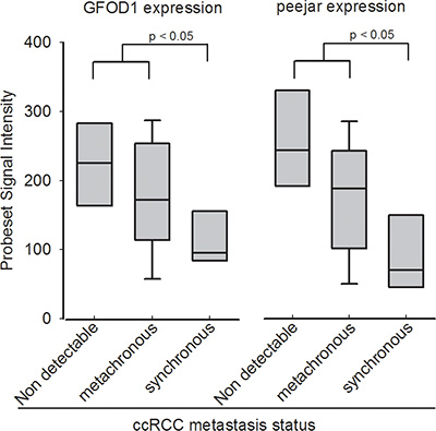 Figure 1: Probeset signal intensity of 219821_s_at (GFOD1) and 230179_at (peejar) from Dataset E-GEOD-22541. Patients with non-detectable metastasis after at least 99 months follow-up shown highest GFOD1 and peejar expression in tumor samples. Patients with synchronous metastasis disease shown lowest GFOD1 and peejar expression in tumor samples, and significant difference compared to patients with non-detectable or metachronous metastasis disease.